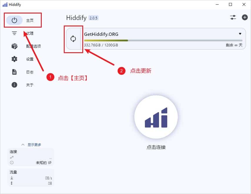 点击软件界面左侧菜单主页,点击更新图标即可更新配置文件,如下图所示。