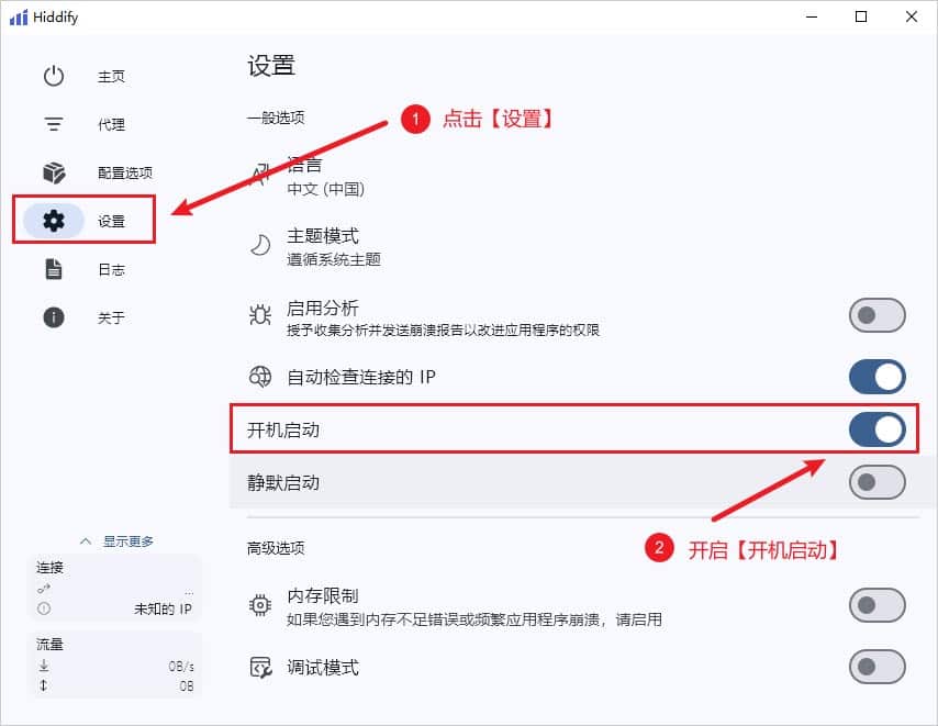 设置开机自启动,点击软件界面左侧菜单设置选项卡,找到开机启动并开启开关即可,开启状态下按钮状态为蓝色,如下图所示为开启状态。
