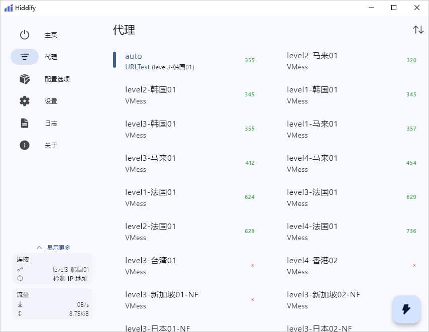 在添加完订阅地址之后,如果需要切换代理节点,点击软件主界面左侧的代理选项卡,在代理列表里选择一个合适的代理节点即可,如下图所示。