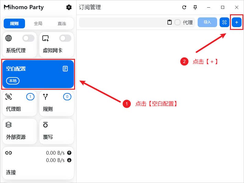 本地配置文件即通过本地文件拖拽导入,一般为无法通过远程订阅地址导入的情况下使用,可尝试在浏览器中下载配置文件后,点击左侧菜单空白配置,点击➕按钮,如下图所示,选择打开随后在弹出的窗口选择本地配置文件即可。