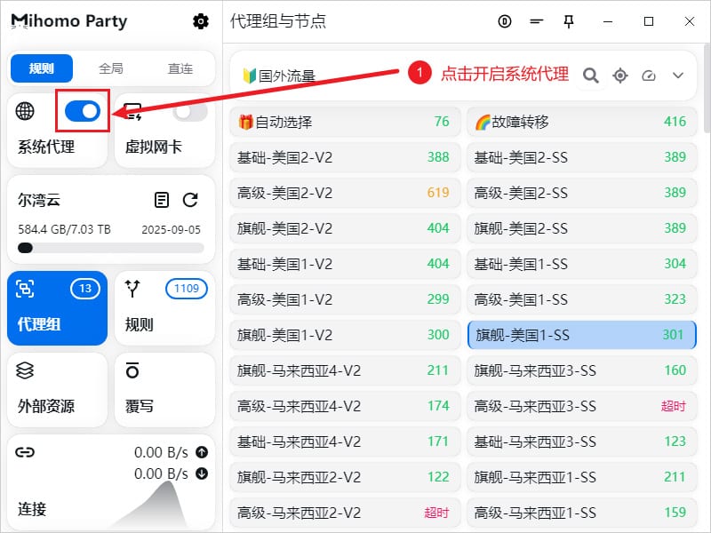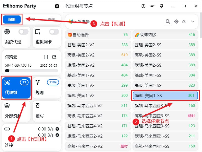 在添加完订阅地址之后,需要选择一个代理节点使用,点击软件主界面左侧的代理组选项卡,软件右上角代理规则处默认保持规则即可,代理模式主要有以下三种: